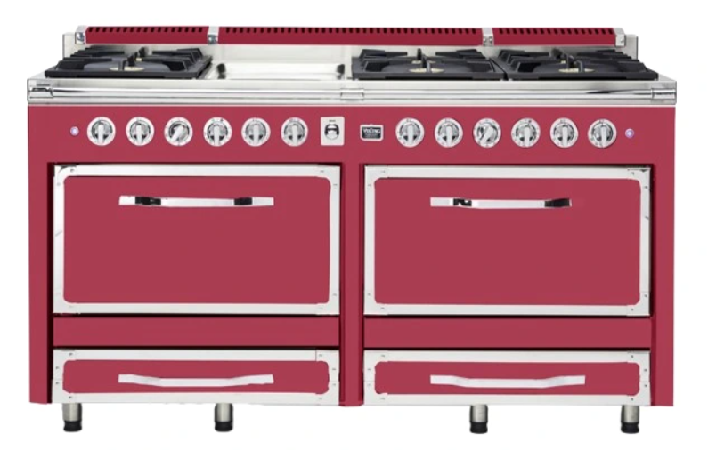 The Viking® Tuscany Valentine 66" 8-Burner Dual Fuel Range offers bold elegance with its vibrant red