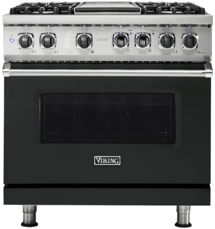 The Viking® 36'' Antique Bronze Dual Fuel Range features a sleek design, self-cleaning oven, and dua