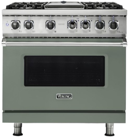 The Viking® Eucalyptus 36" Self-Cleaning Dual Fuel Range with Griddle combines luxury and performanc