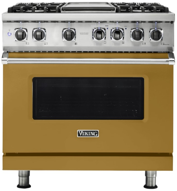 The Viking® 36'' Golden Hour Dual Fuel Range features a sleek design, self-cleaning oven, and dual f