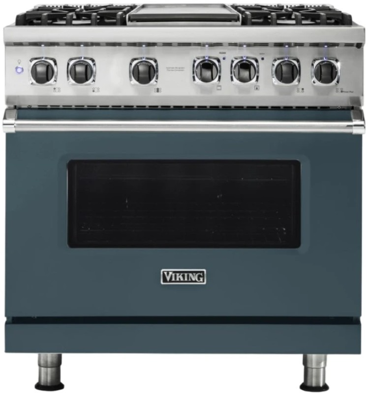 The Viking® 36'' Squall Dual Fuel Range features a sleek design, self-cleaning oven, and dual fuel t