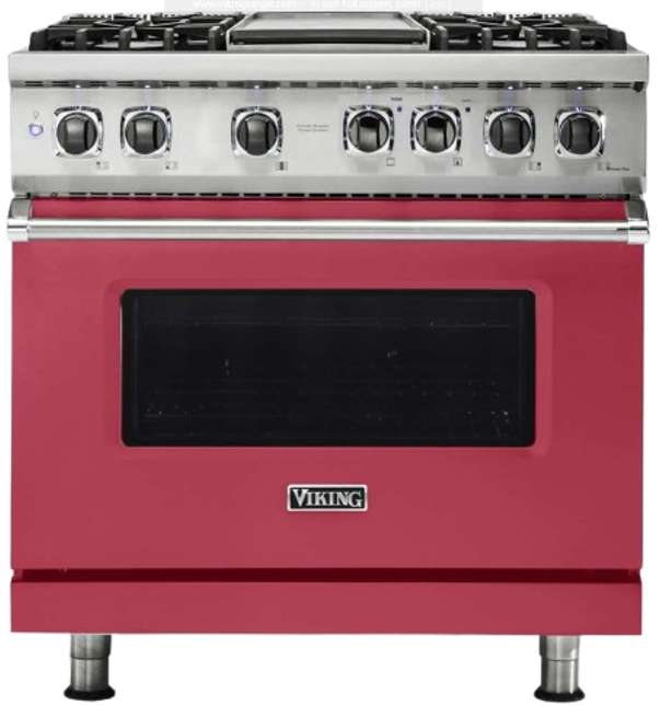 The Viking® Valentine 36" Self-Cleaning Dual Fuel Range with Griddle combines luxury and performance