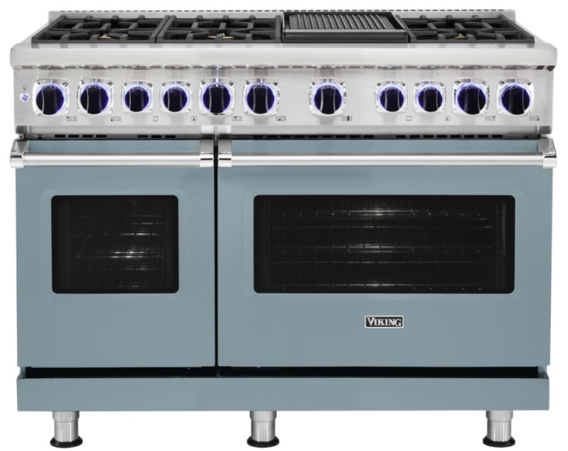 48" Dual Fuel Range with Sealed Burners, featuring six burners and a griddle. Combines gas and elect