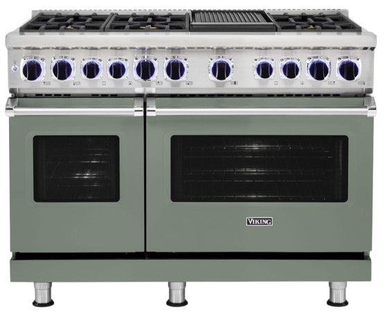 The Viking® 7 Series Eucalyptus 48'' Dual Fuel Sealed Burner Range offers a striking eucalyptus fini