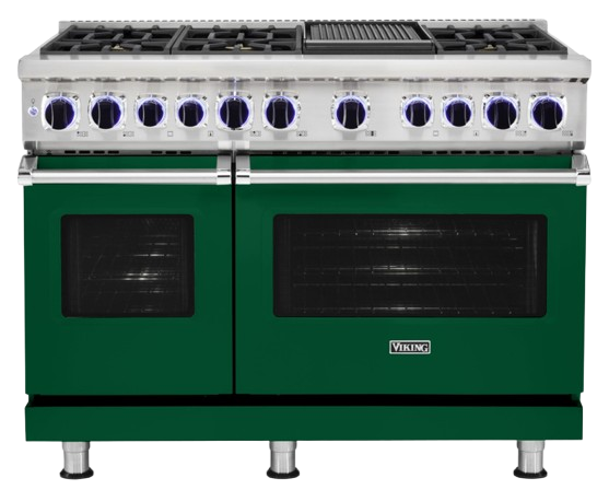 The Viking® 7 Series Ivy 48'' Dual Fuel Sealed Burner Range features a rich, deep ivy finish paired