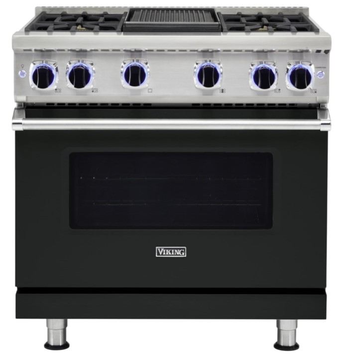 Viking® 36" Gas Range features four sealed burners and a griddle, offering precise heat control and