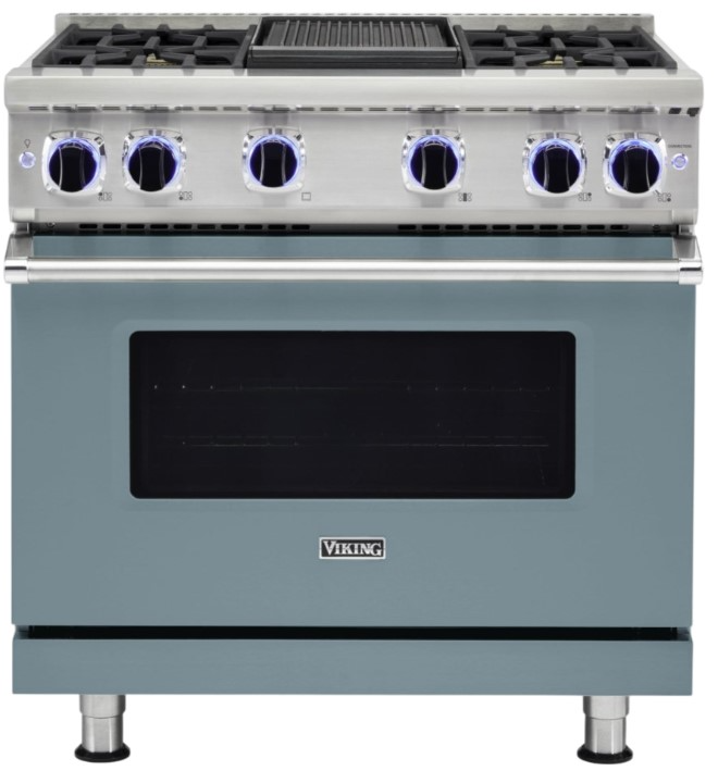 Viking® 36" Gas Range features four sealed burners and a griddle, offering precise heat control and